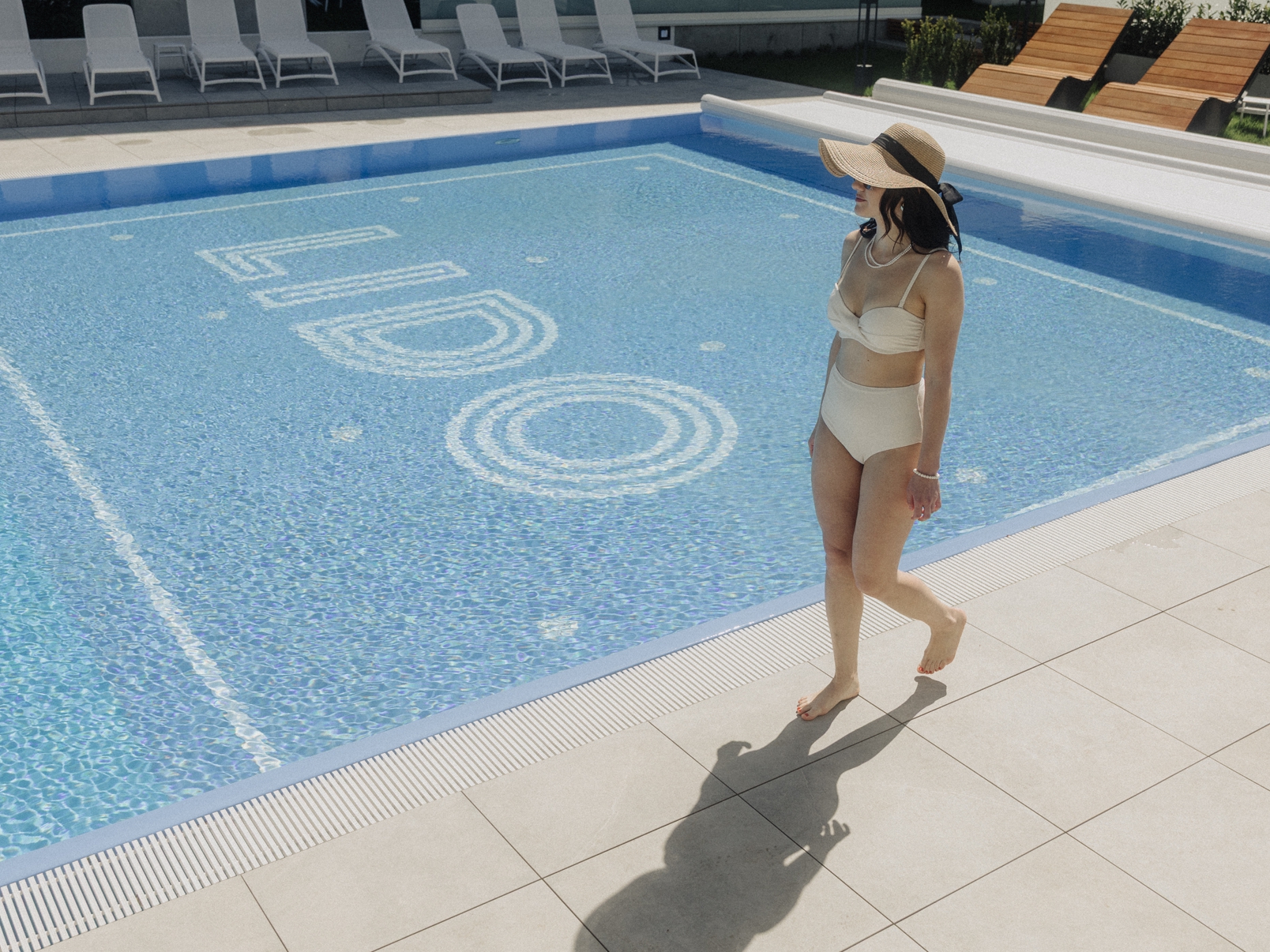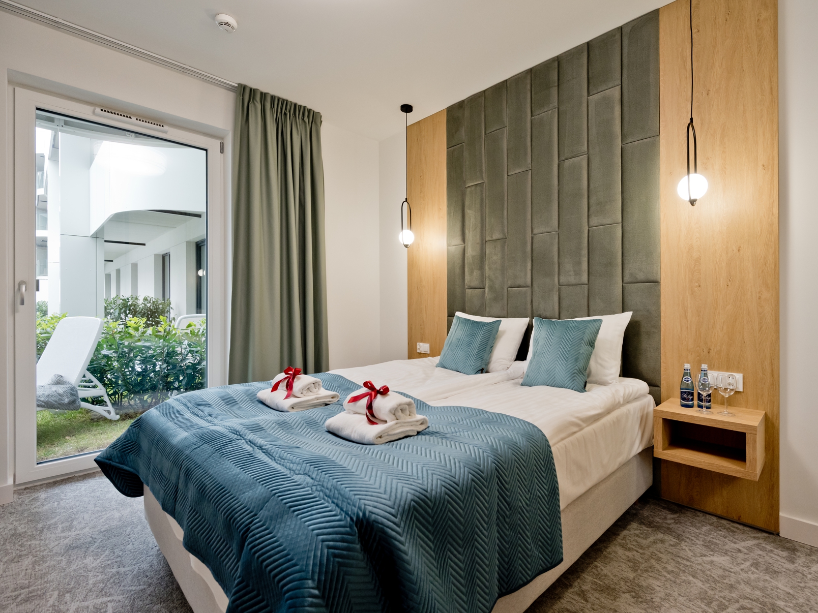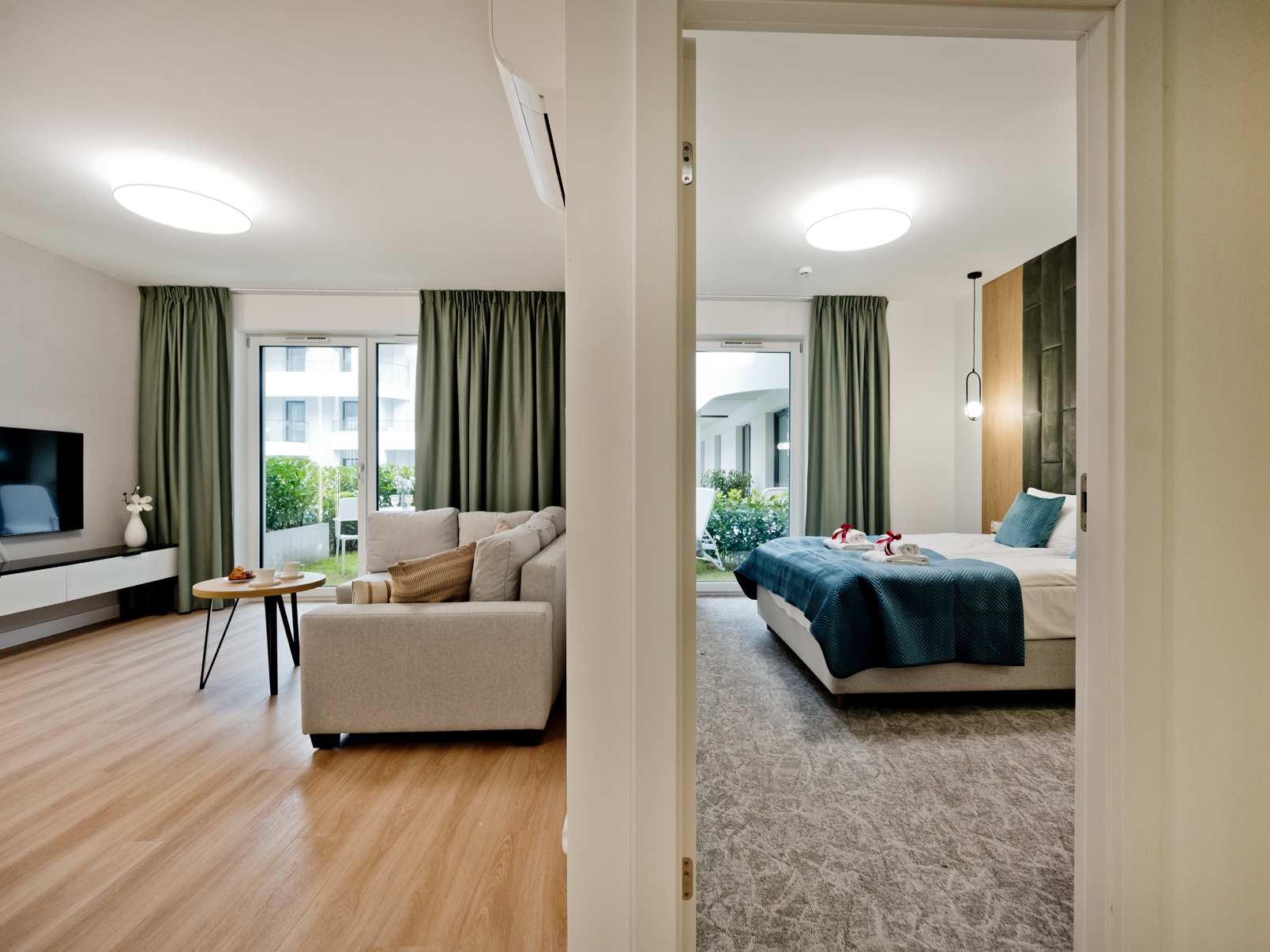 Elegancki, klimatyzowany apartament składa się z przestronnego salonu z aneksem kuchennym, oddzielnej sypialni oraz komfortowej łazienki. Z salonu i sypialni wychodzi się na prywatny ogródek z widokiem i bezpośrednim zejściem na basen – idealne miejsce na poranną kawę lub wieczorny relaks. Wnętrze apartamentu zaprojektowane zostało z dbałością o detale, łącząc nowoczesny design z nawiązaniami do stylu art déco.