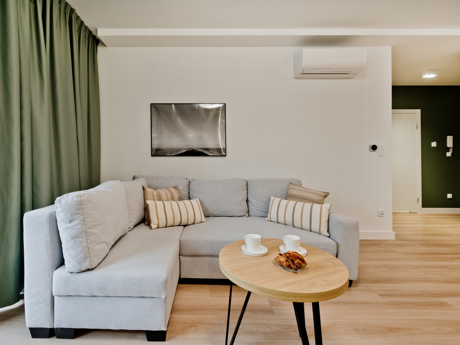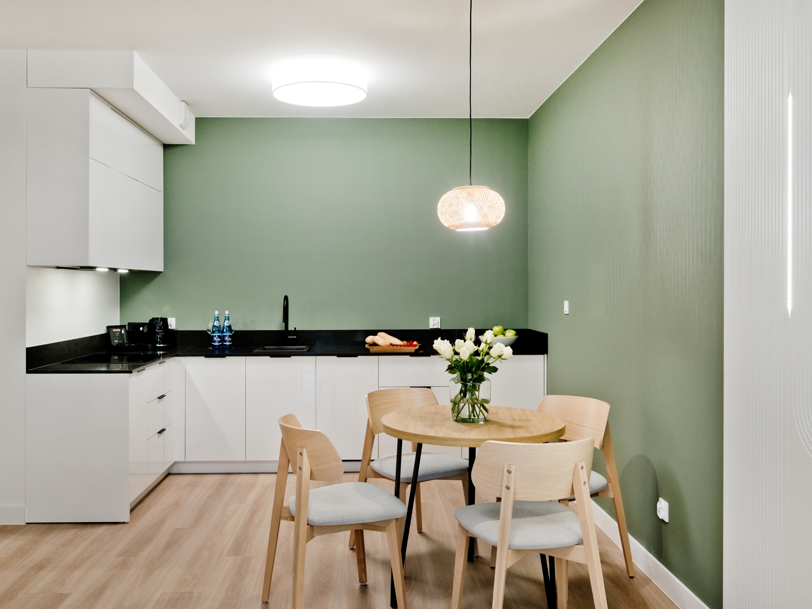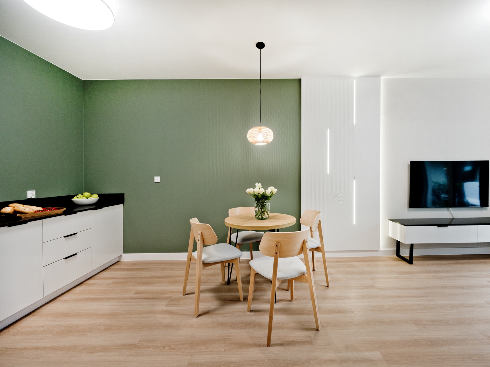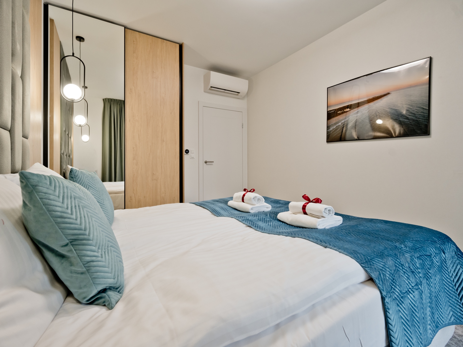 Goście apartamentu mają do dyspozycji szybkie Wi-Fi bez dodatkowych opłat, klimatyzację, w pełni wyposażony aneks kuchenny (płyta grzewcza, lodówka, ekspres do kawy, zmywarka), telewizor z płaskim ekranem oraz wygodną przestrzeń do wypoczynku i pracy. Apartament pomieści komfortowo do 4 osób – to doskonały wybór zarówno dla par, jak i rodzin z dziećmi. Do apartamentu przynależy miejsce postojowe na terenie obiektu.
