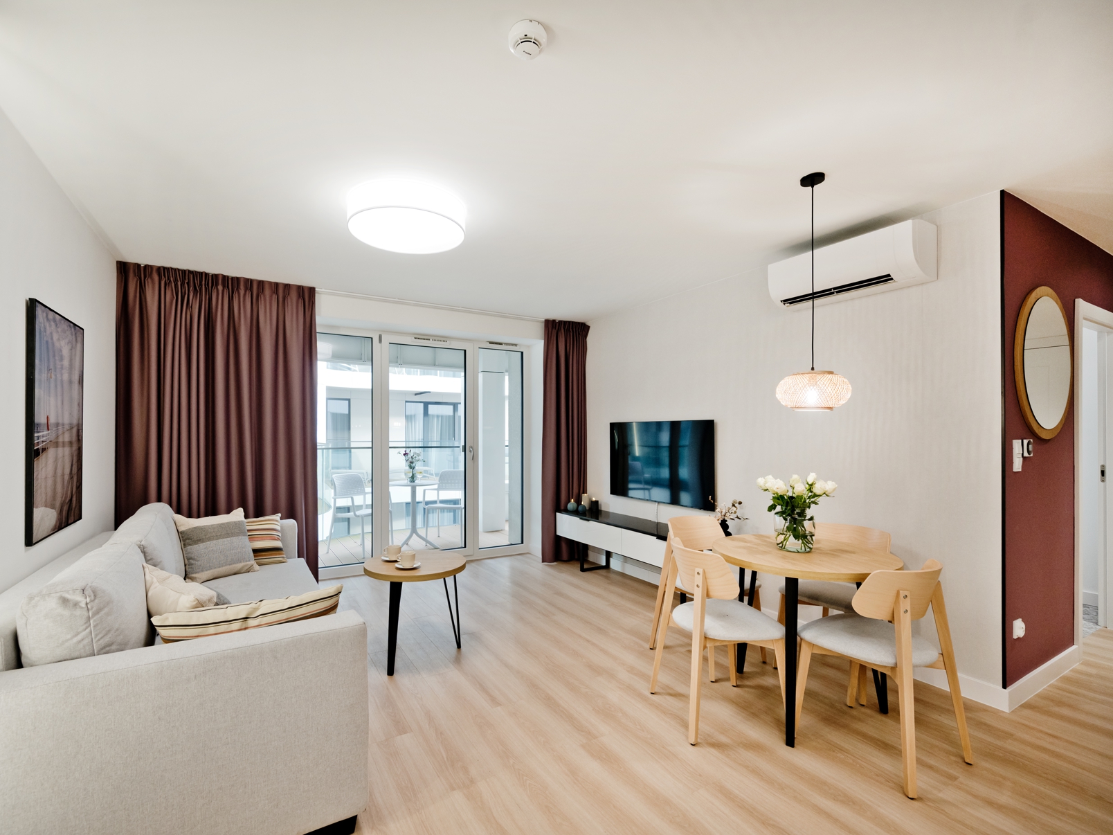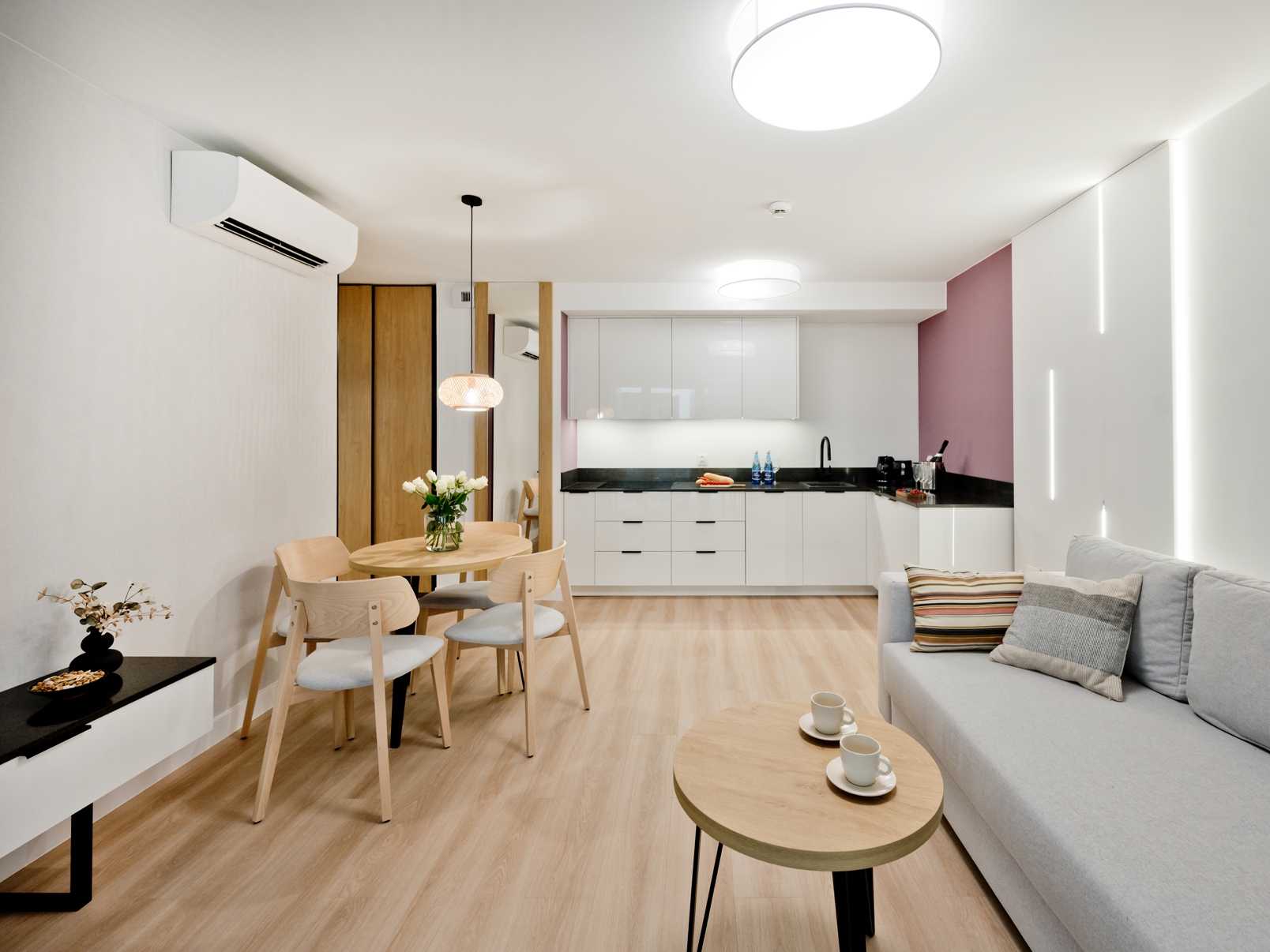 Goście apartamentu mają do dyspozycji szybkie Wi-Fi bez dodatkowych opłat, klimatyzację, w pełni wyposażony aneks kuchenny (płyta grzewcza, lodówka, ekspres do kawy, zmywarka), telewizor z płaskim ekranem oraz wygodną przestrzeń do wypoczynku i pracy. Apartament pomieści komfortowo do 4 osób – to doskonały wybór zarówno dla par, jak i rodzin z dziećmi. Do apartamentu przynależy miejsce postojowe na terenie hotelu.