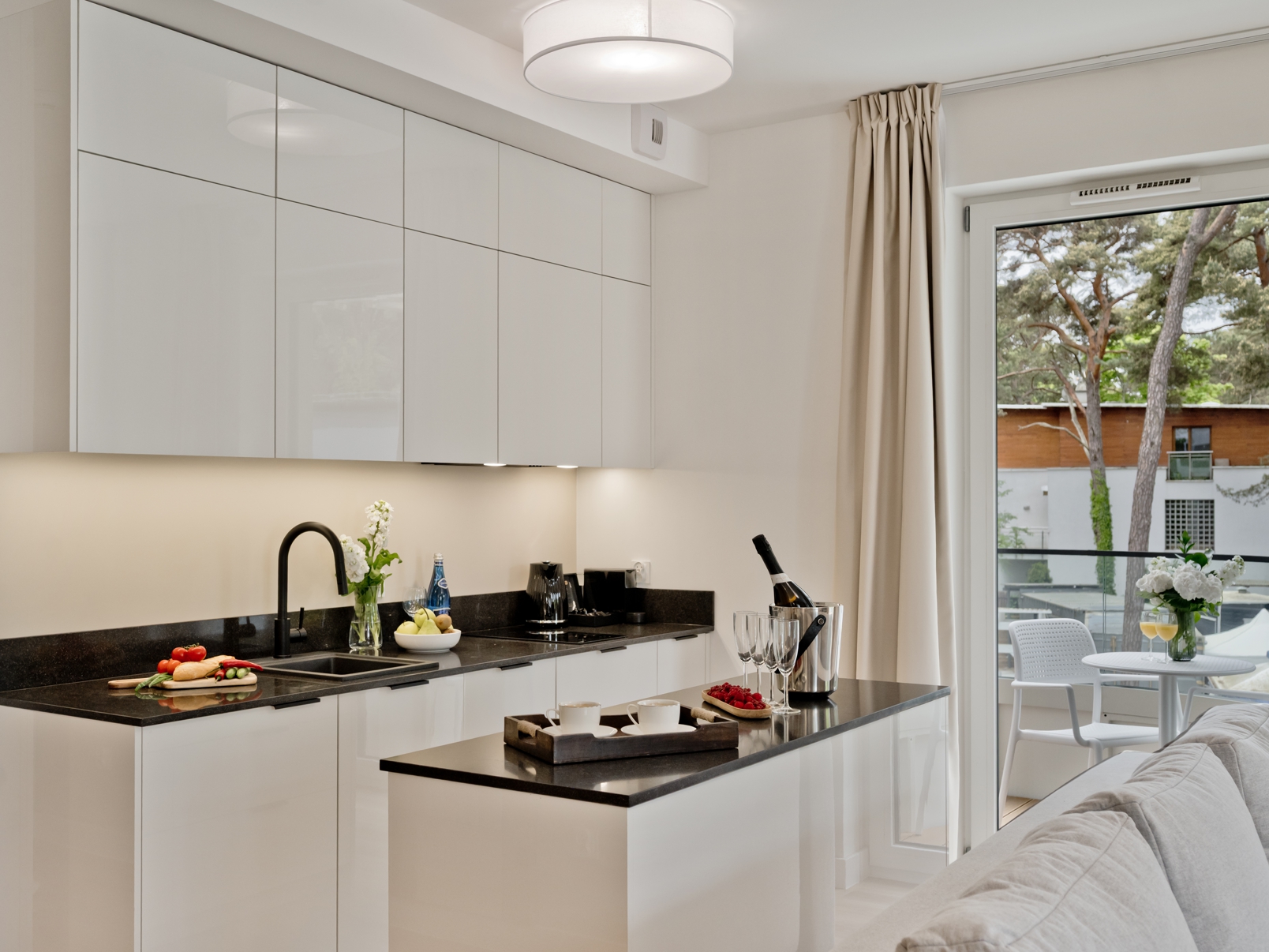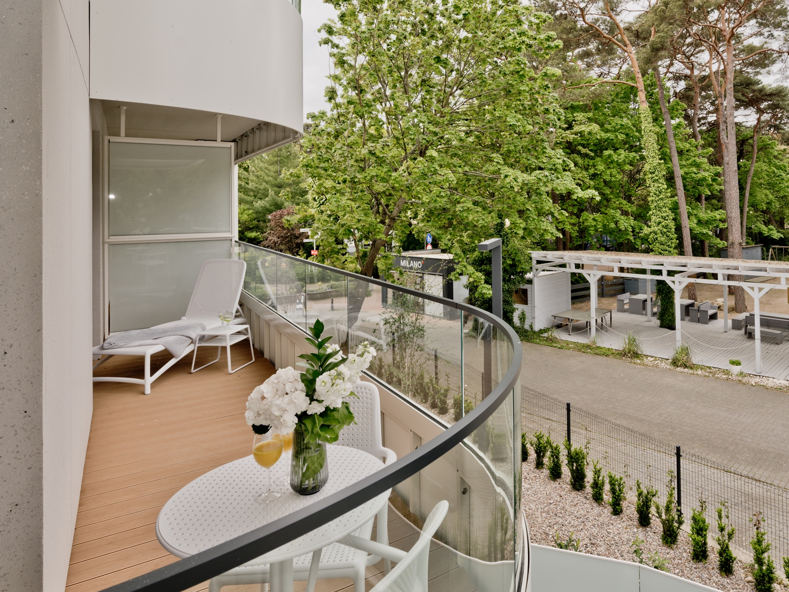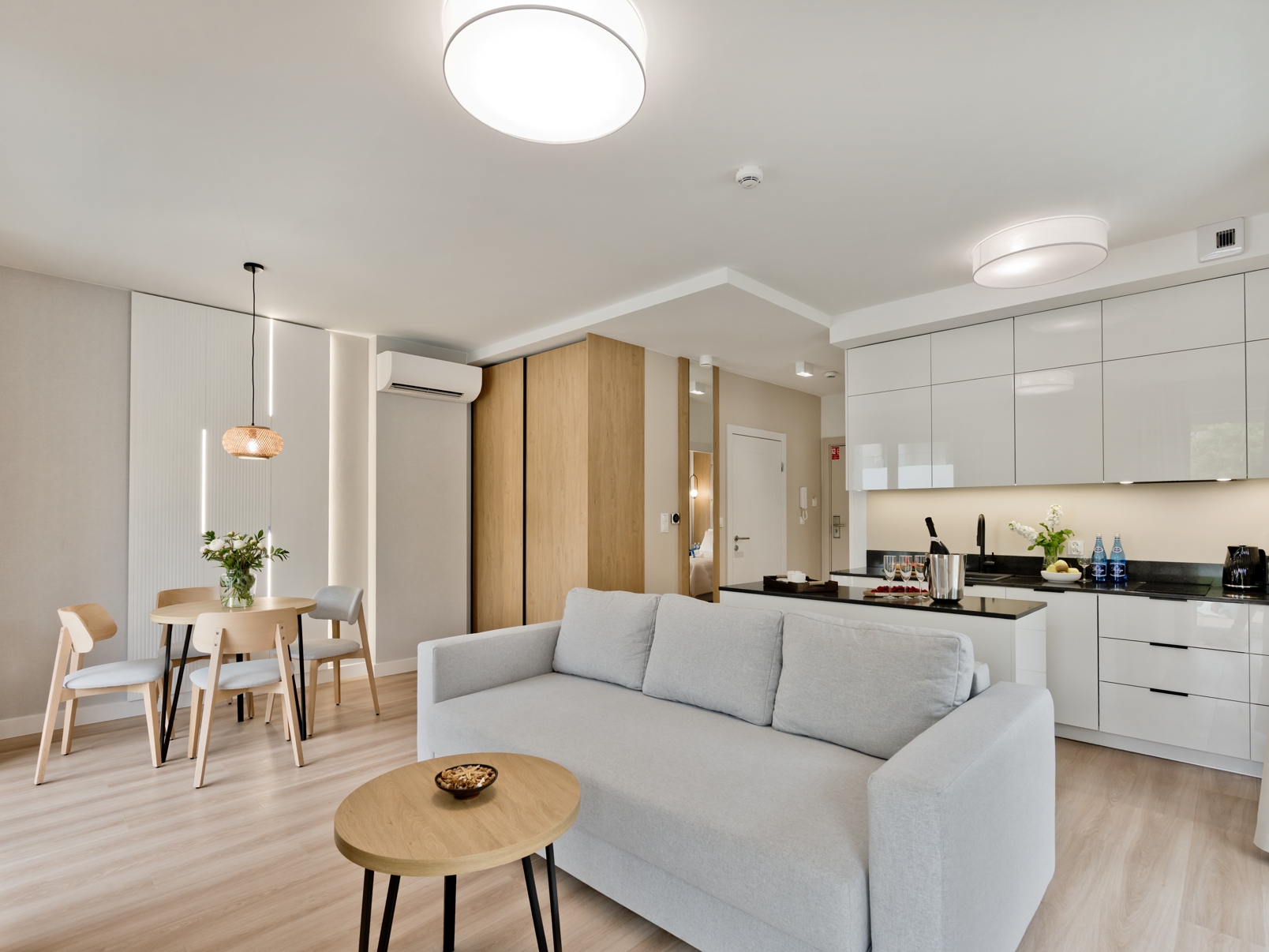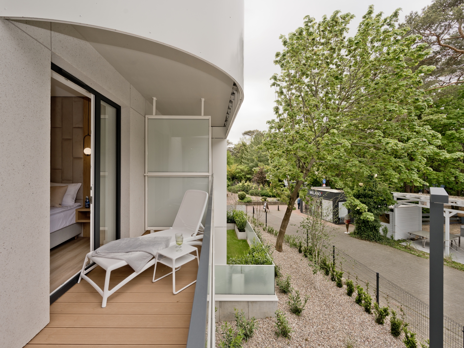 Elegancki, klimatyzowany apartament typu premium składa się z przestronnego salonu z aneksem kuchennym, oddzielnej sypialni oraz komfortowej łazienki. Z salonu oraz sypialni wychodzi się na prywatny balkon z widokiem na drzewa – idealne miejsce na poranną kawę lub wieczorny relaks. Wnętrze apartamentu zaprojektowane zostało z dbałością o detale, łącząc nowoczesny design z nawiązaniami do stylu art déco.