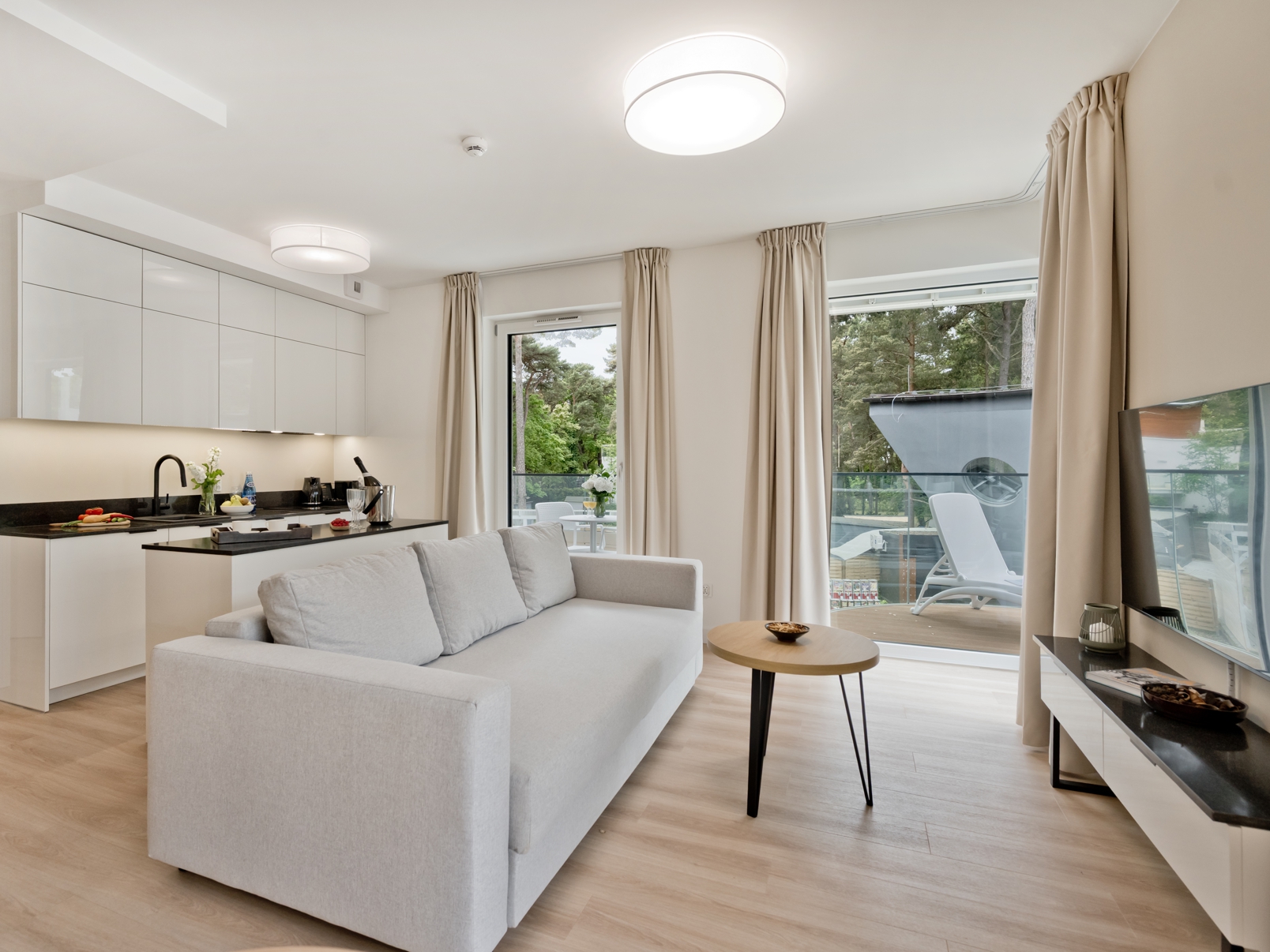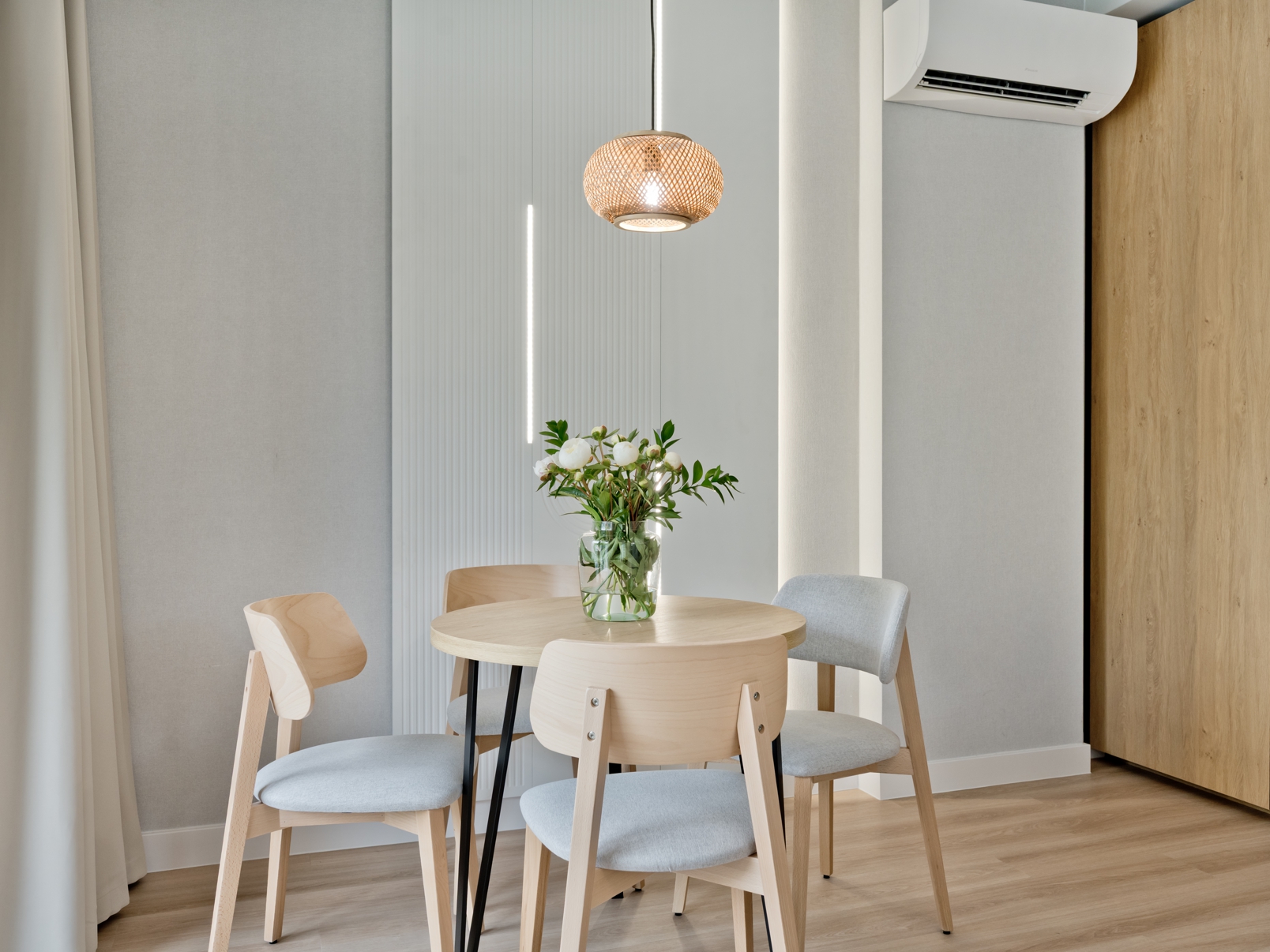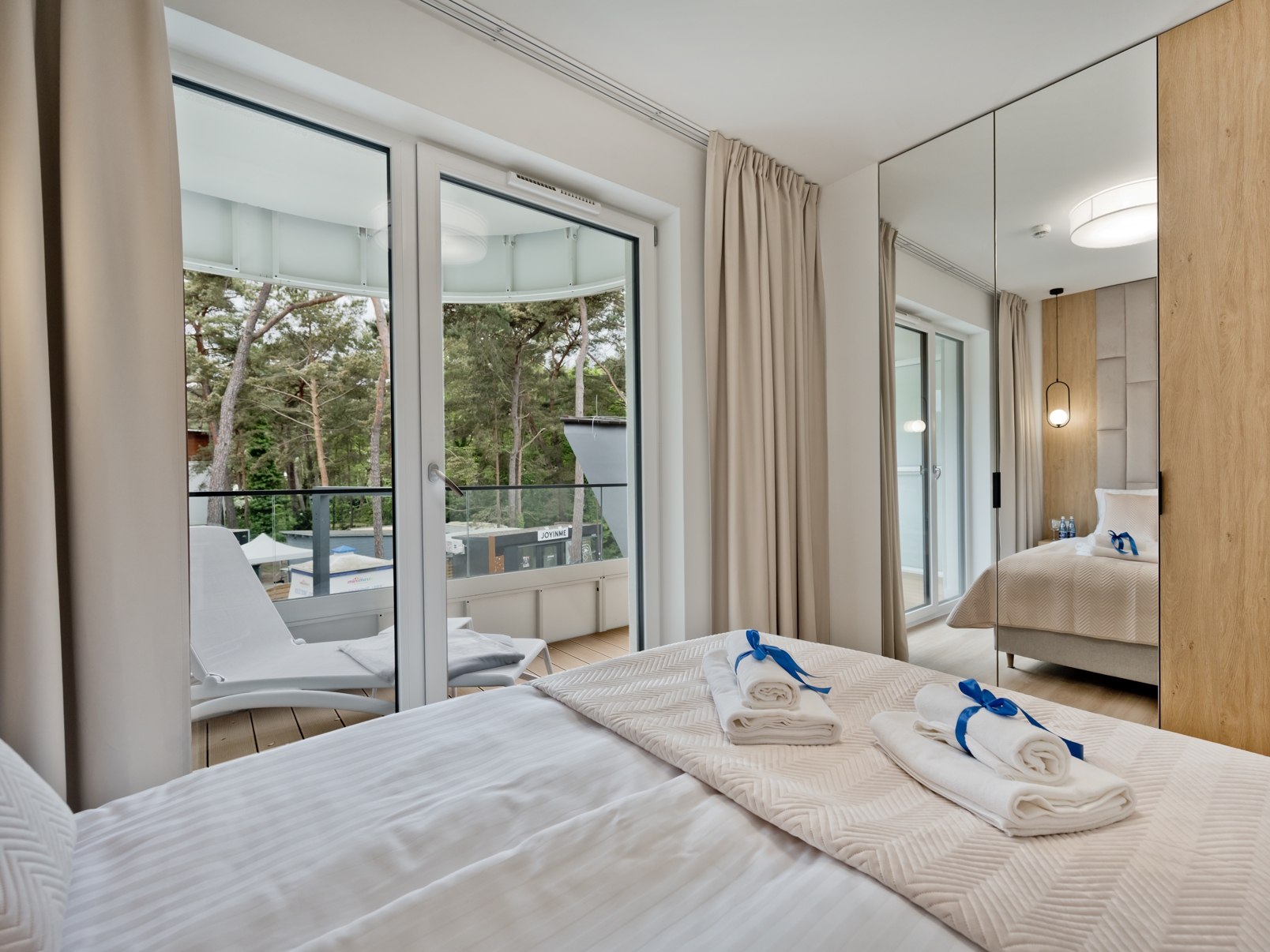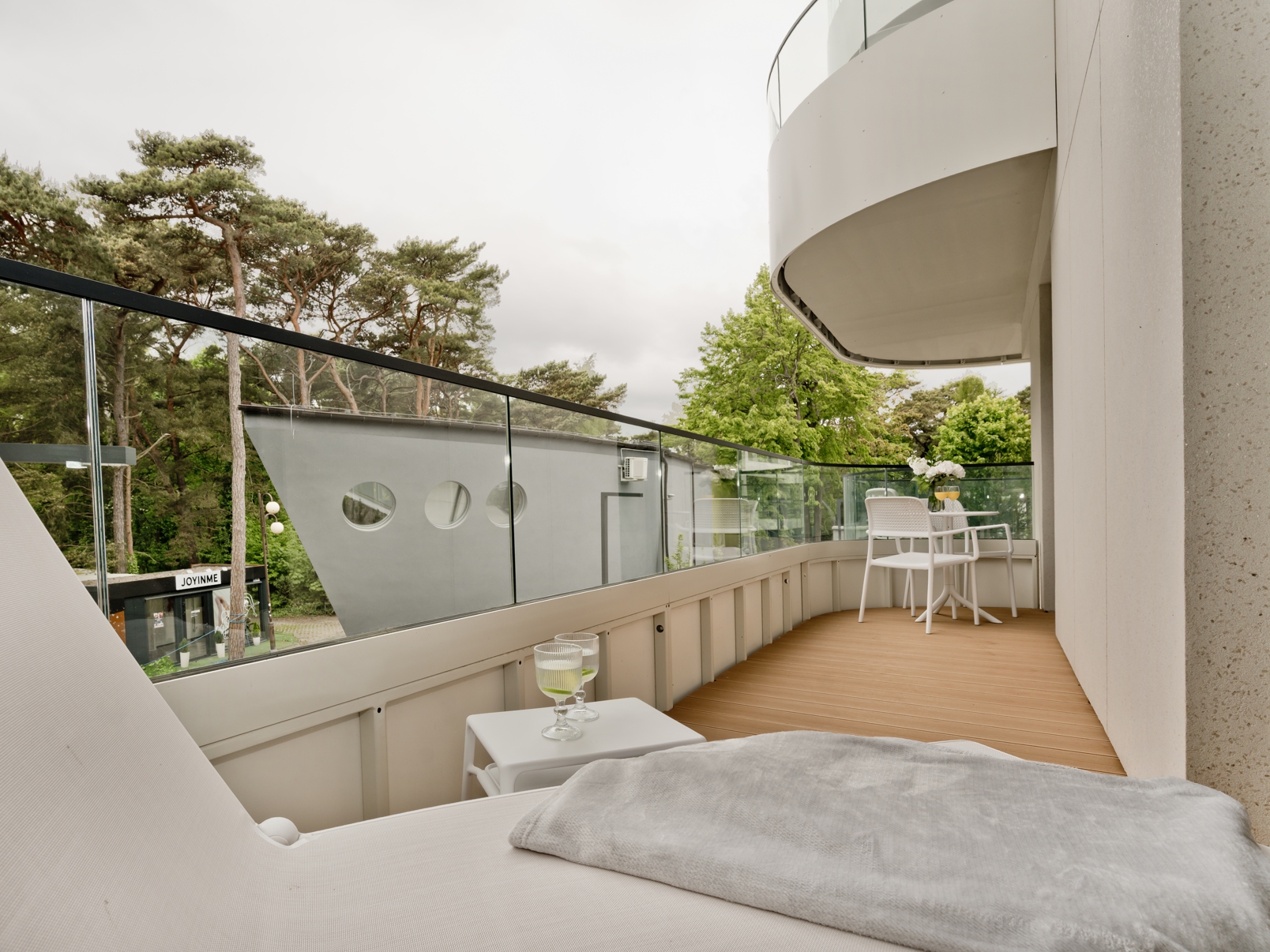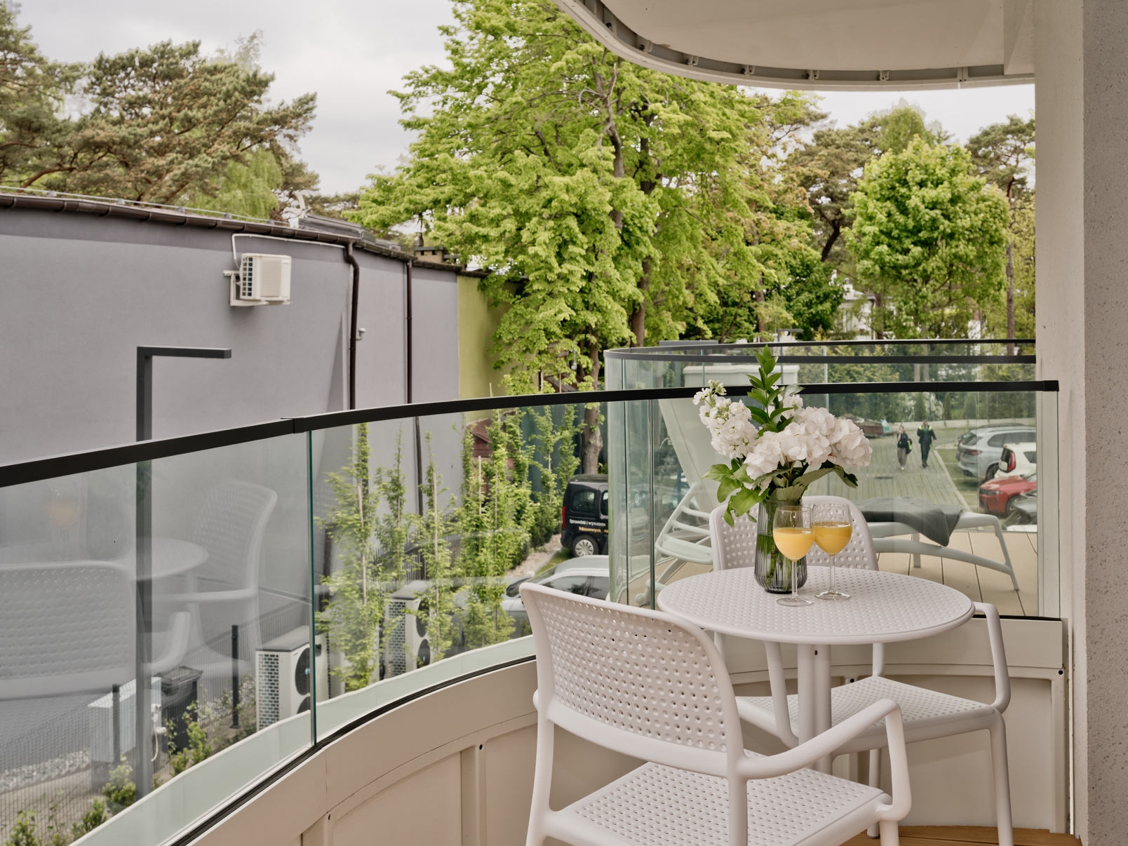 Elegancki, klimatyzowany apartament typu premium składa się z przestronnego salonu z aneksem kuchennym, oddzielnej sypialni oraz komfortowej łazienki. Z salonu oraz sypialni wychodzi się na prywatny balkon z widokiem na drzewa – idealne miejsce na poranną kawę lub wieczorny relaks. Wnętrze apartamentu zaprojektowane zostało z dbałością o detale, łącząc nowoczesny design z nawiązaniami do stylu art déco.