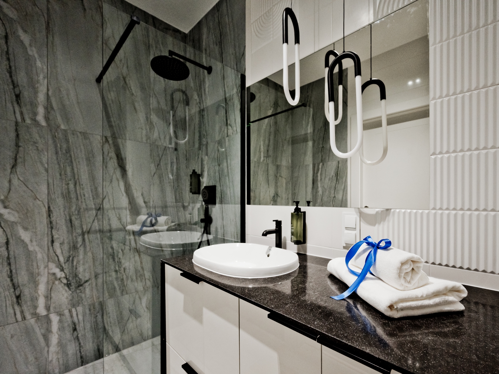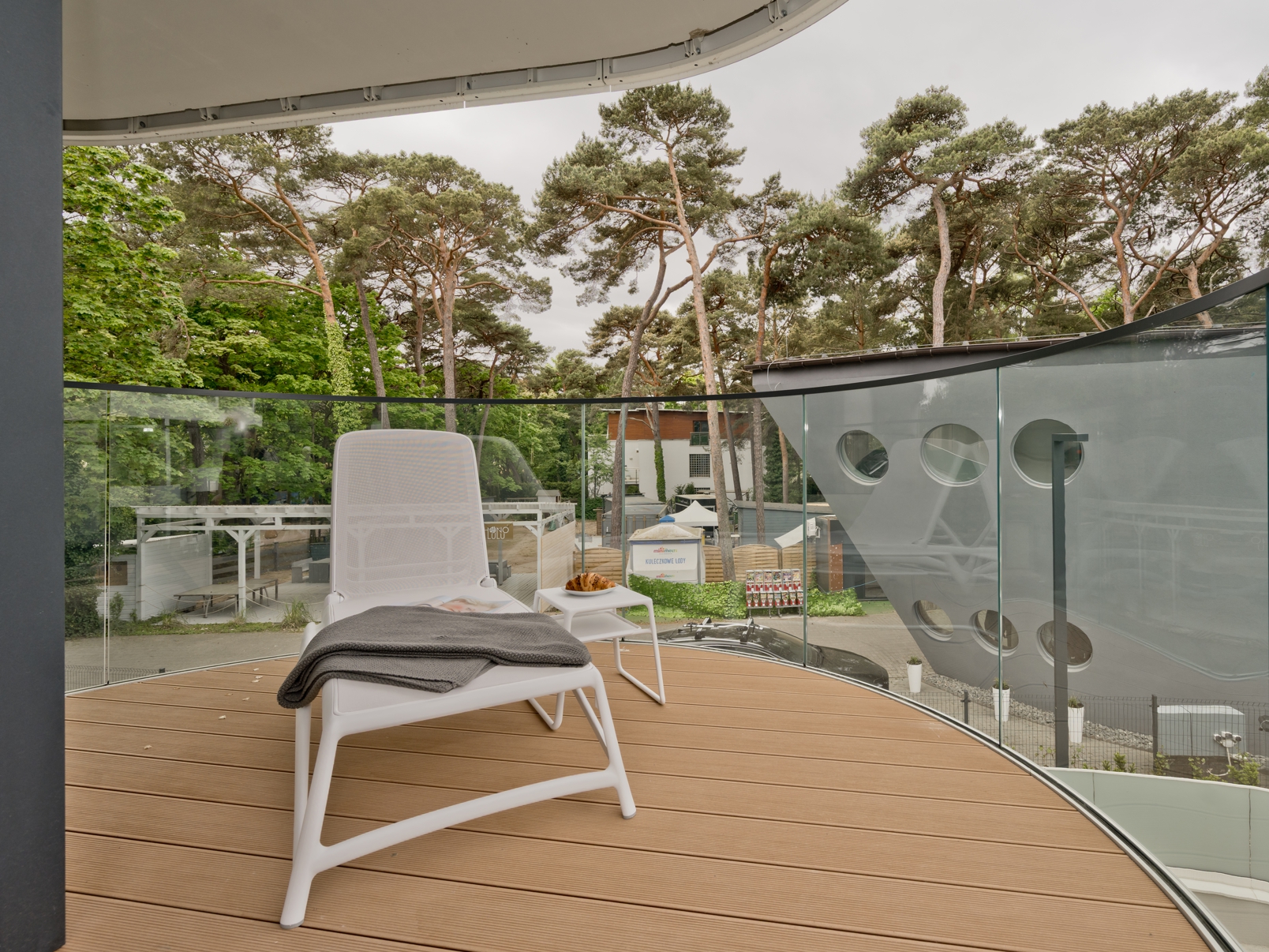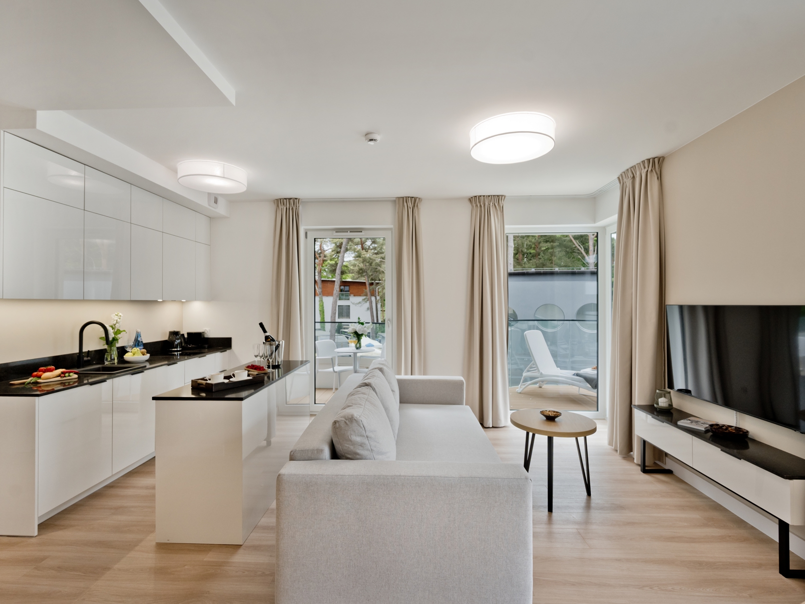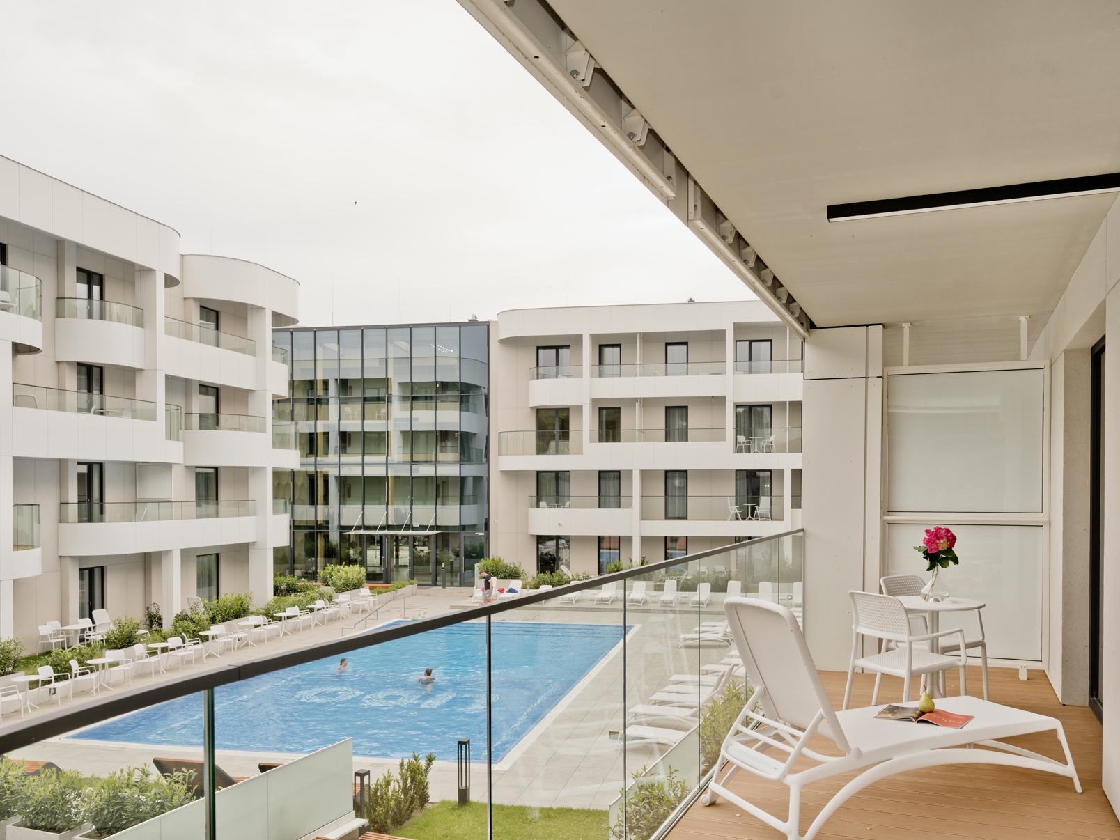 Elegancki, klimatyzowany apartament typu premium składa się z przestronnego salonu z aneksem kuchennym, oddzielnej sypialni oraz komfortowej łazienki. Z salonu oraz sypialni wychodzi się na prywatny balkon z widokiem na drzewa – idealne miejsce na poranną kawę lub wieczorny relaks. Wnętrze apartamentu zaprojektowane zostało z dbałością o detale, łącząc nowoczesny design z nawiązaniami do stylu art déco.