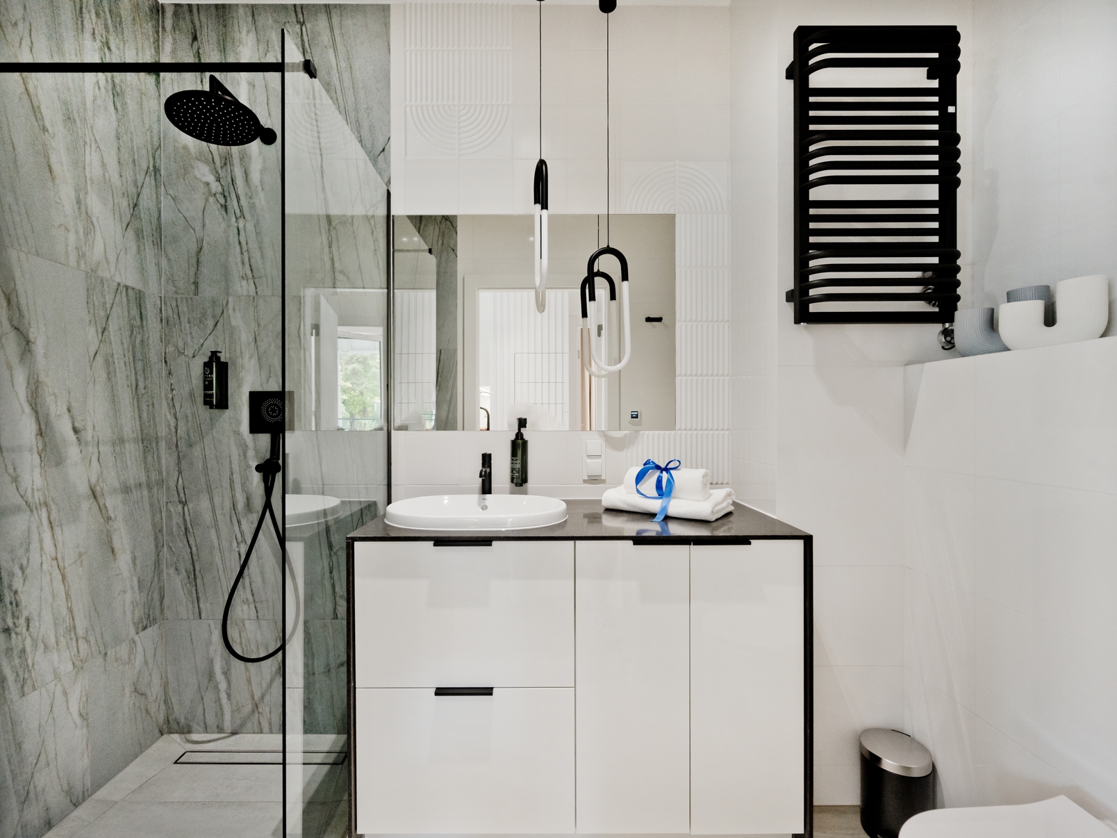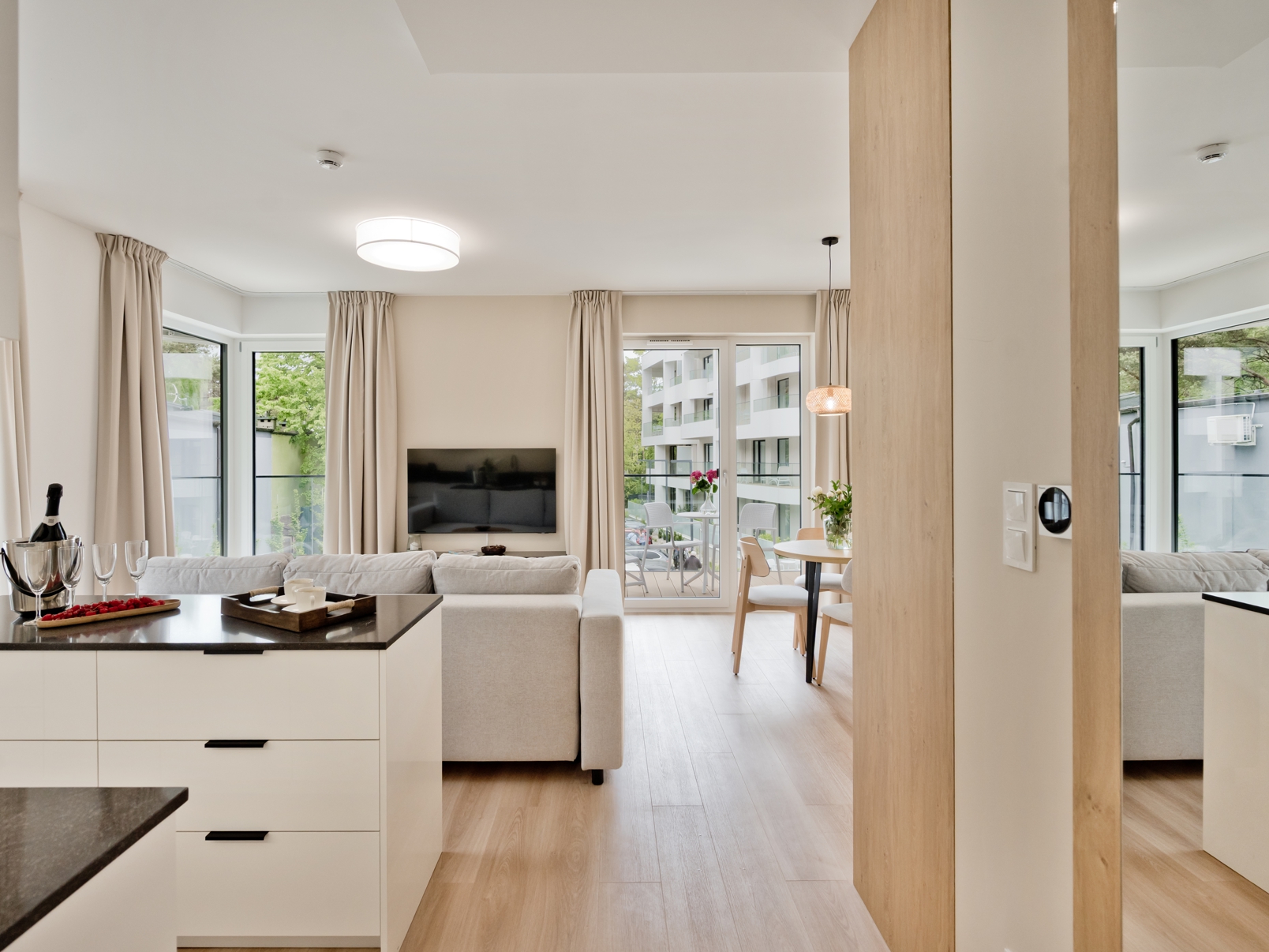 Goście apartamentu mają do dyspozycji szybkie Wi-Fi bez dodatkowych opłat, klimatyzację, w pełni wyposażony aneks kuchenny (płyta grzewcza, lodówka, ekspres do kawy, zmywarka), telewizor z płaskim ekranem oraz wygodną przestrzeń do wypoczynku i pracy. Apartament pomieści komfortowo do 4 osób – to doskonały wybór zarówno dla par, jak i rodzin z dziećmi. Do apartamentu przynależy miejsce postojowe w garażu podziemnym.