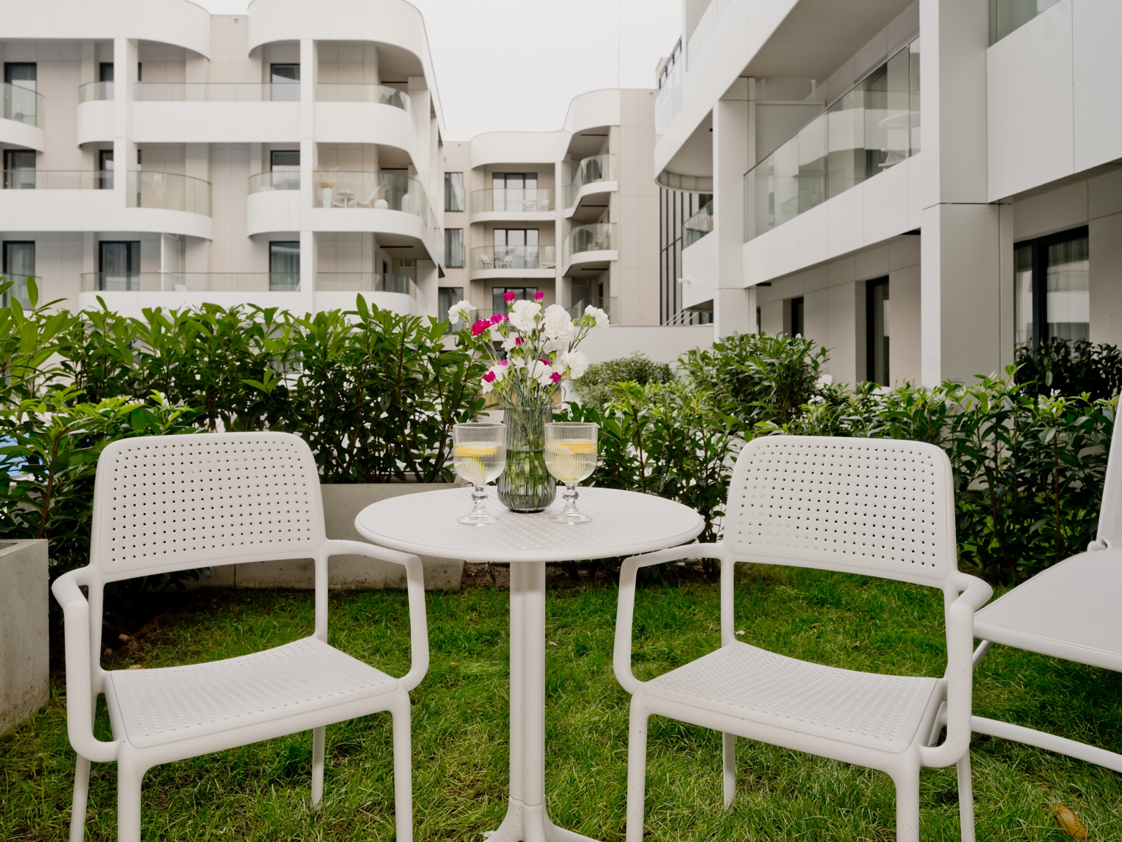 Elegancki, klimatyzowany apartament składa się z przestronnego salonu z aneksem kuchennym, oddzielnej sypialni oraz komfortowej łazienki. Z salonu i sypialni wychodzi się na prywatny ogródek z widokiem i bezpośrednim zejściem na basen – idealne miejsce na poranną kawę lub wieczorny relaks. Wnętrze apartamentu zaprojektowane zostało z dbałością o detale, łącząc nowoczesny design z nawiązaniami do stylu art déco.