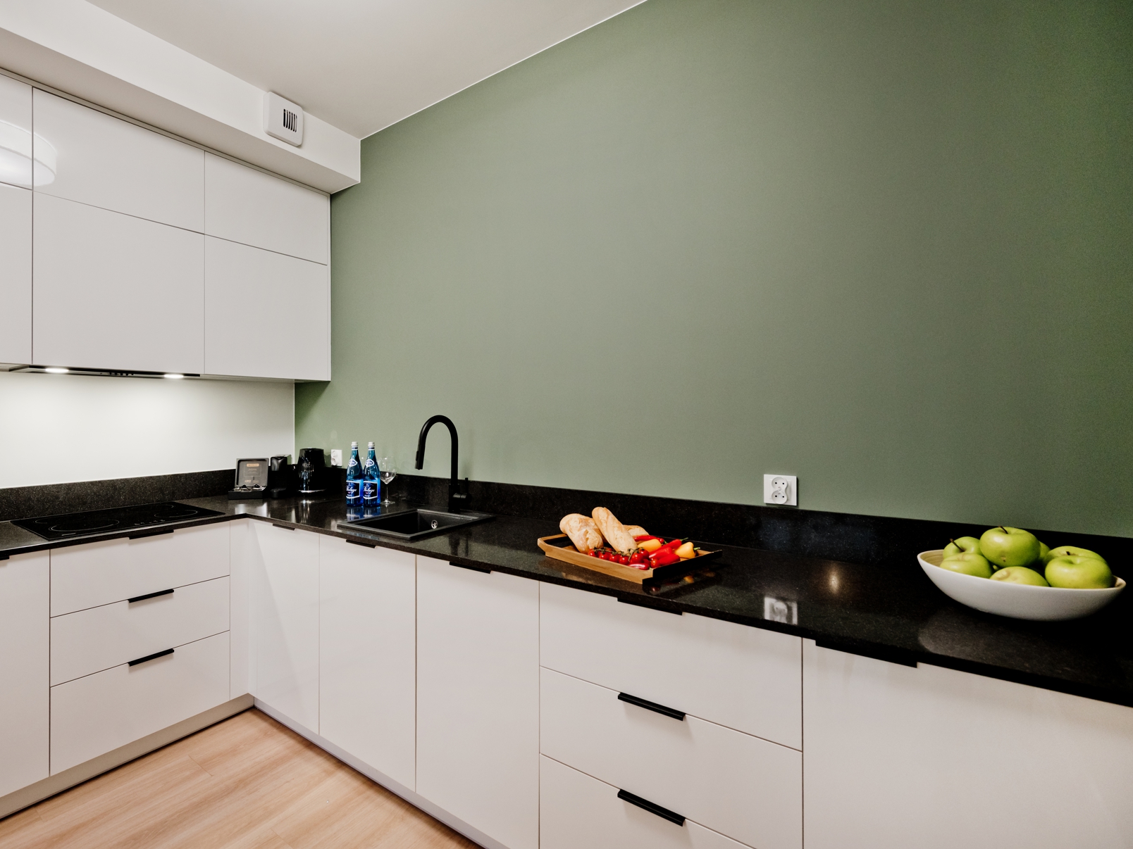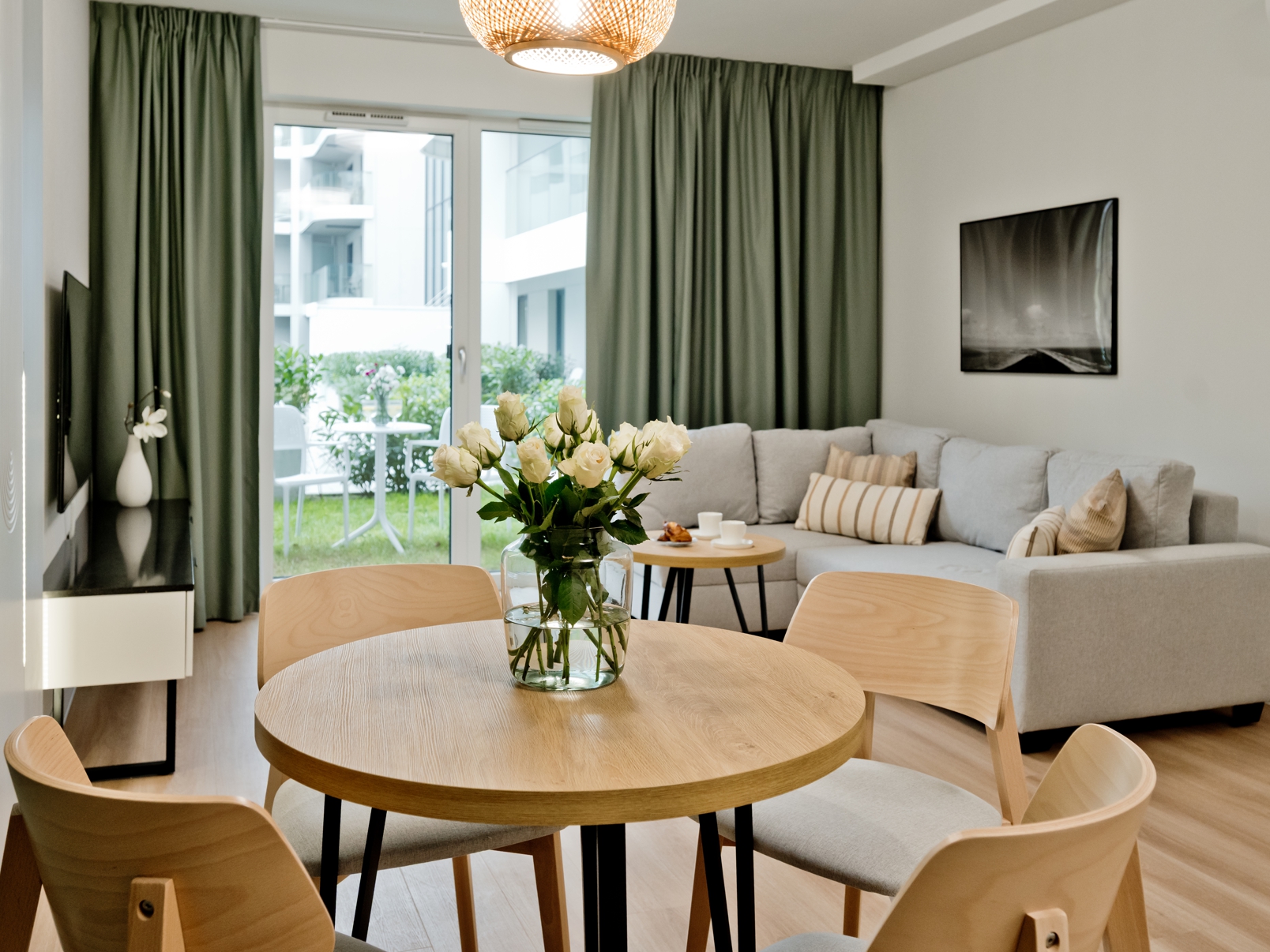 Goście apartamentu mają do dyspozycji szybkie Wi-Fi bez dodatkowych opłat, klimatyzację, w pełni wyposażony aneks kuchenny (płyta grzewcza, lodówka, ekspres do kawy, zmywarka), telewizor z płaskim ekranem oraz wygodną przestrzeń do wypoczynku i pracy. Apartament pomieści komfortowo do 4 osób – to doskonały wybór zarówno dla par, jak i rodzin z dziećmi. Do apartamentu przynależy miejsce postojowe na terenie obiektu.