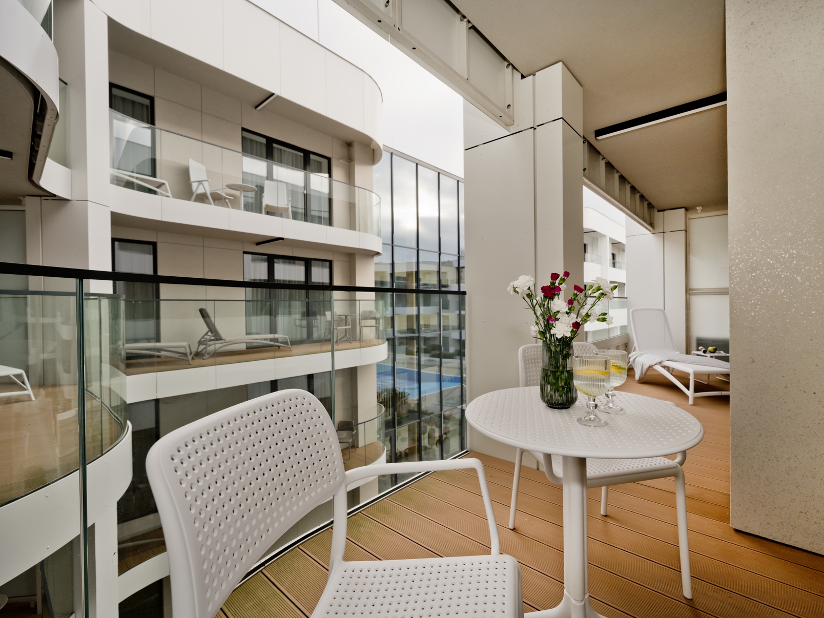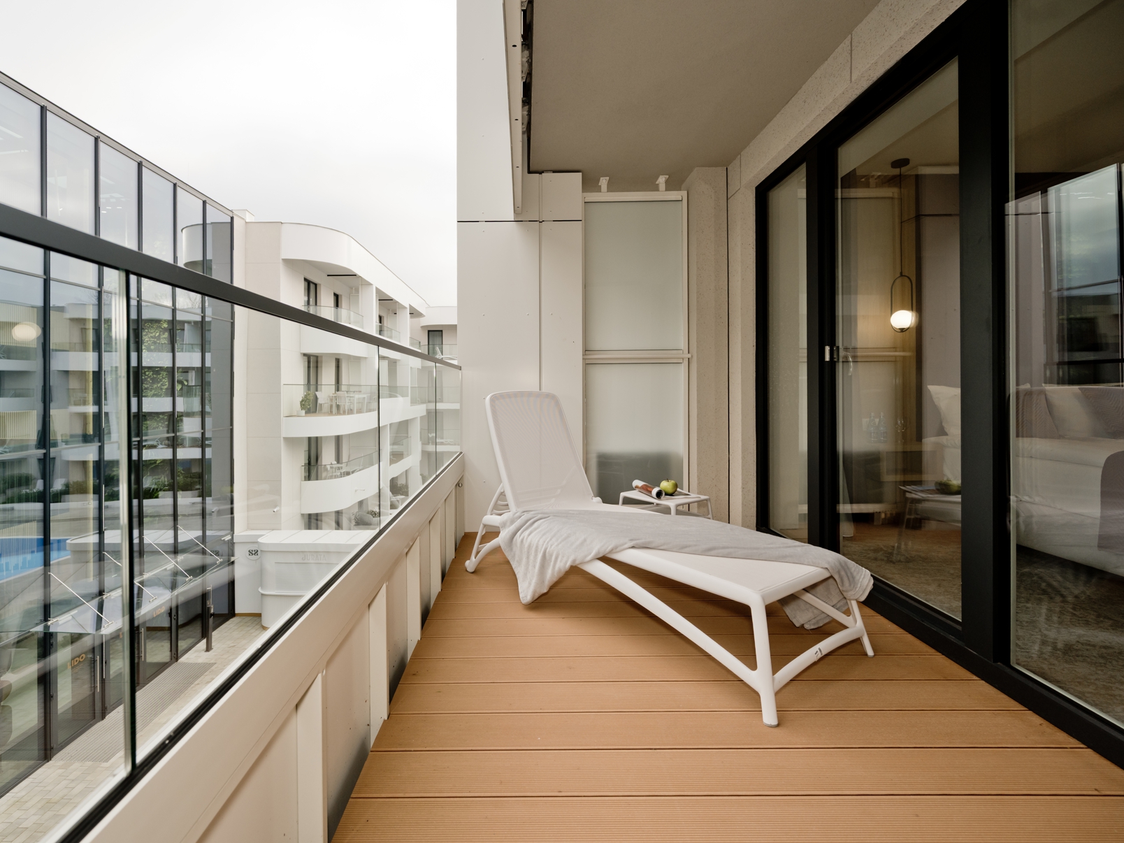Elegancki, klimatyzowany apartament składa się z przestronnego salonu z aneksem kuchennym, oddzielnej sypialni oraz komfortowej łazienki. Z salonu wychodzi się na prywatny balkon z widokiem na basen – idealne miejsce na poranną kawę lub wieczorny relaks. Wnętrze apartamentu zaprojektowane zostało z dbałością o detale, łącząc nowoczesny design z nawiązaniami do stylu art déco.