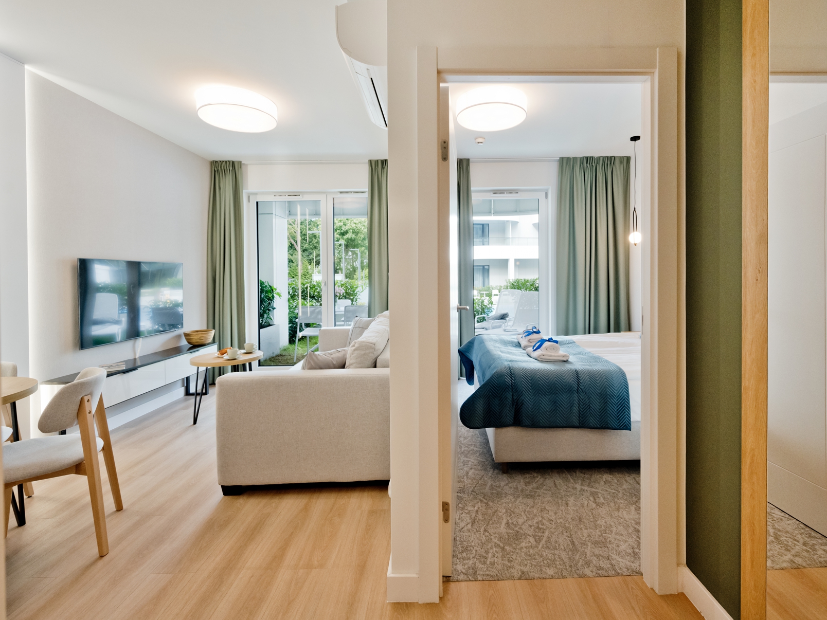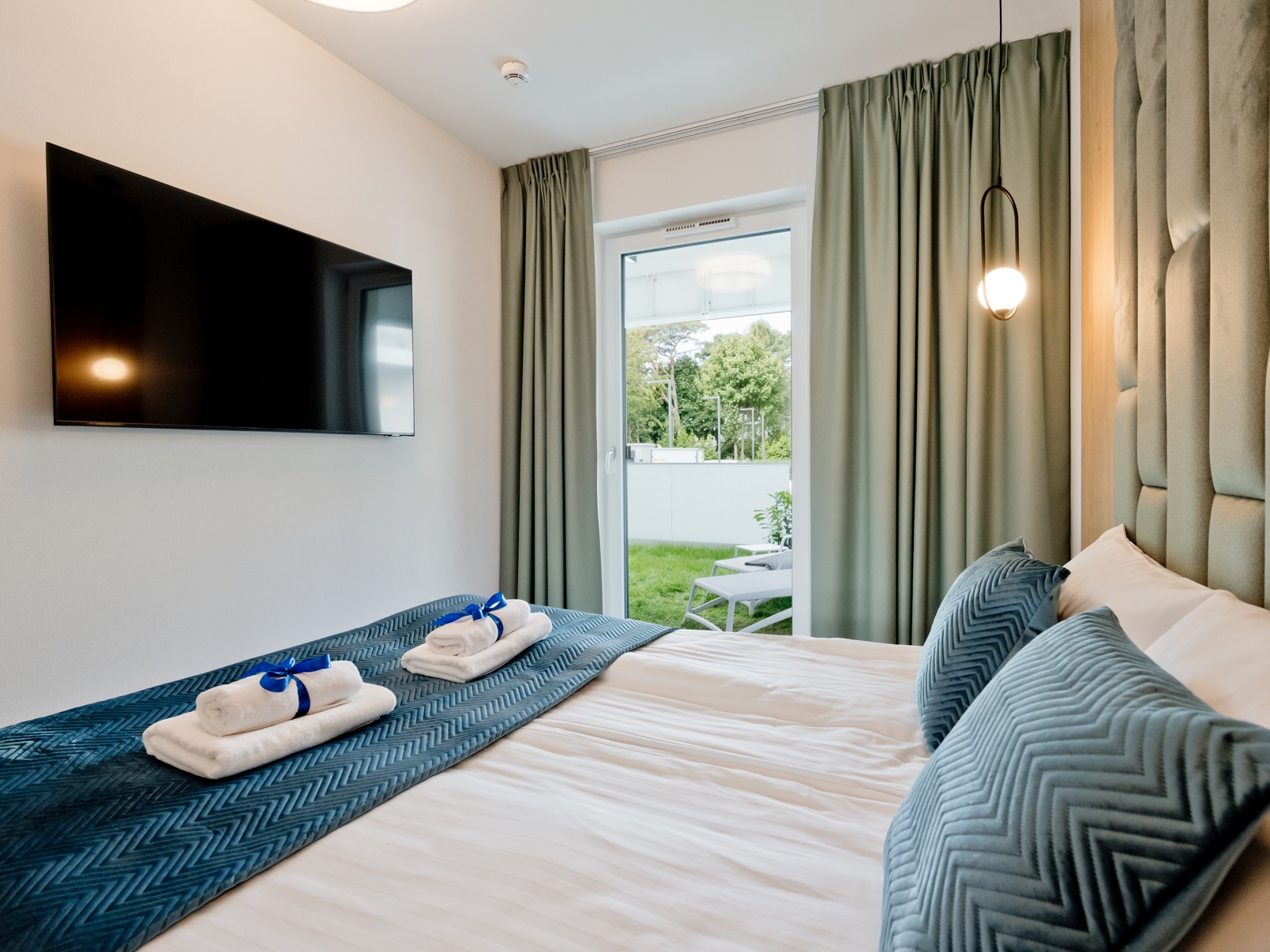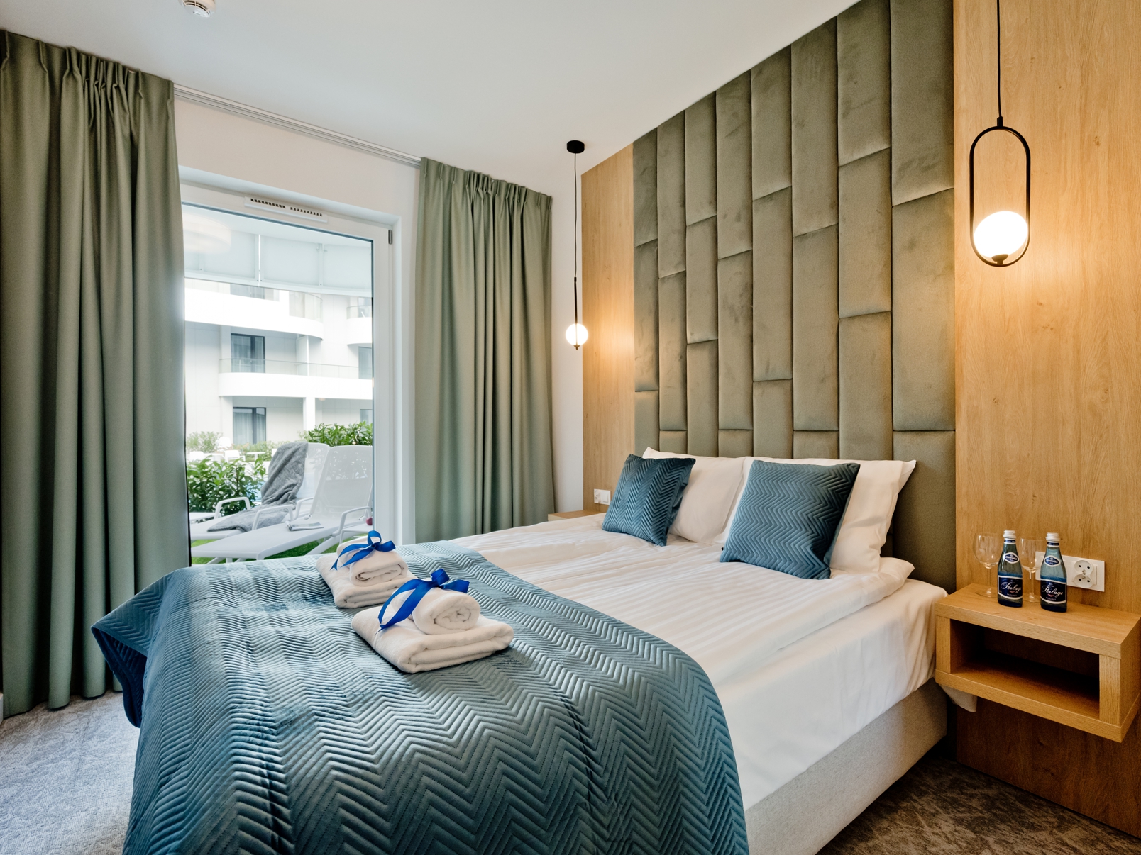 Elegancki, klimatyzowany apartament składa się z przestronnego salonu z aneksem kuchennym, oddzielnej sypialni oraz komfortowej łazienki.W salonie i w sypialni znajduje się telewizor. Z salonu i sypialni wychodzi się na prywatny ogródek z widokiem i bezpośrednim zejściem na basen – idealne miejsce na poranną kawę lub wieczorny relaks. Wnętrze apartamentu zaprojektowane zostało z dbałością o detale, łącząc nowoczesny design z nawiązaniami do stylu art déco.