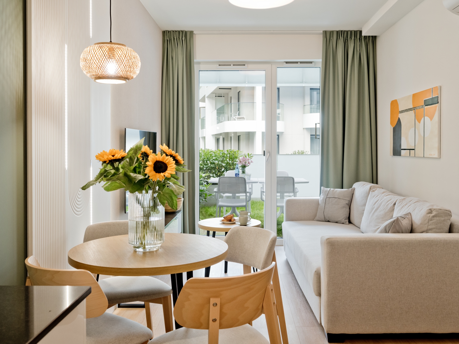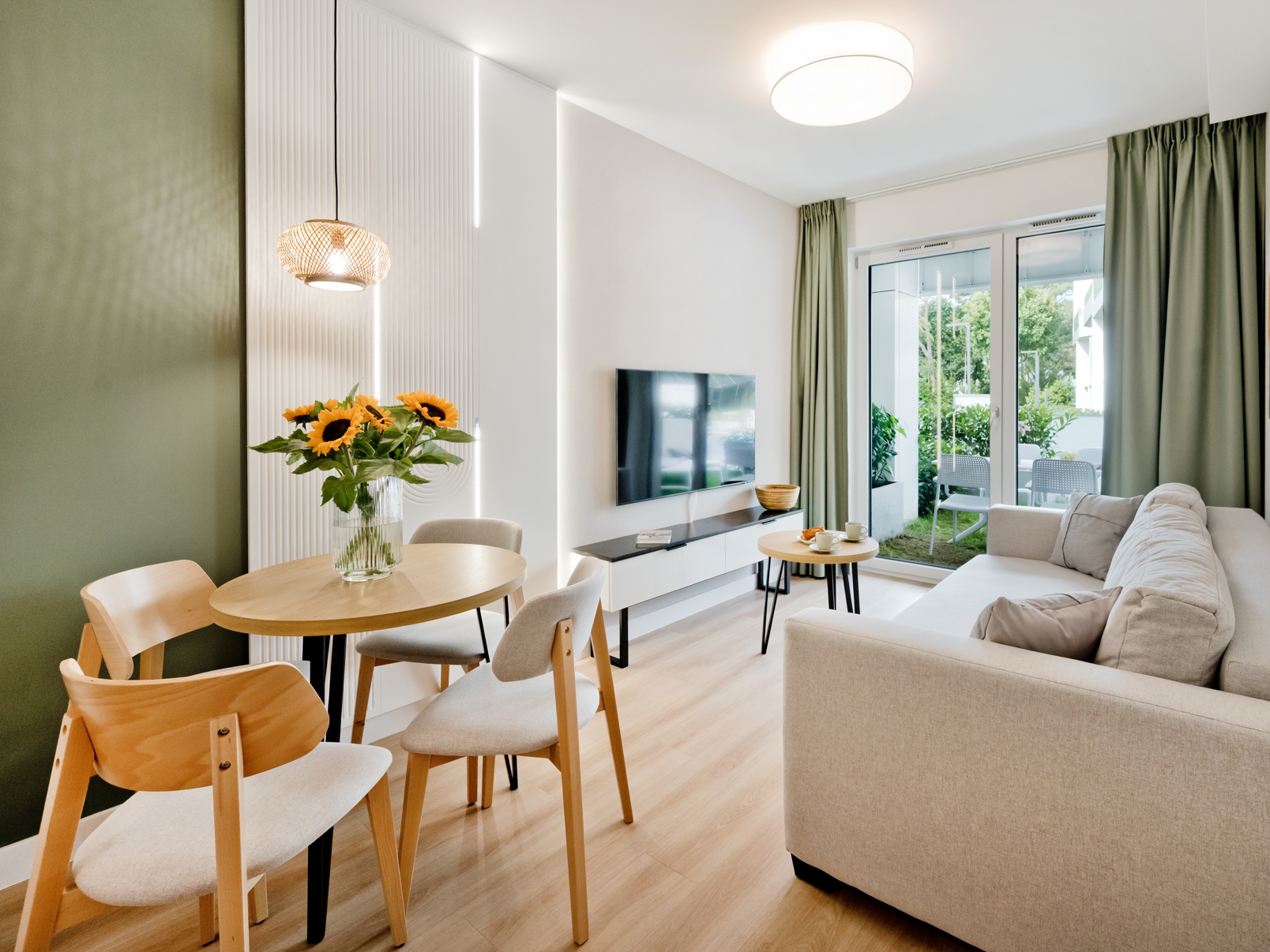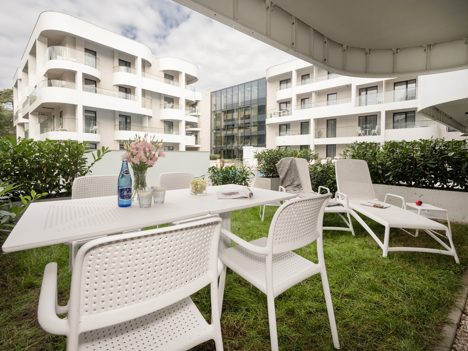 Elegancki, klimatyzowany apartament składa się z przestronnego salonu z aneksem kuchennym, oddzielnej sypialni oraz komfortowej łazienki.W salonie i w sypialni znajduje się telewizor. Z salonu i sypialni wychodzi się na prywatny ogródek z widokiem i bezpośrednim zejściem na basen – idealne miejsce na poranną kawę lub wieczorny relaks. Wnętrze apartamentu zaprojektowane zostało z dbałością o detale, łącząc nowoczesny design z nawiązaniami do stylu art déco.