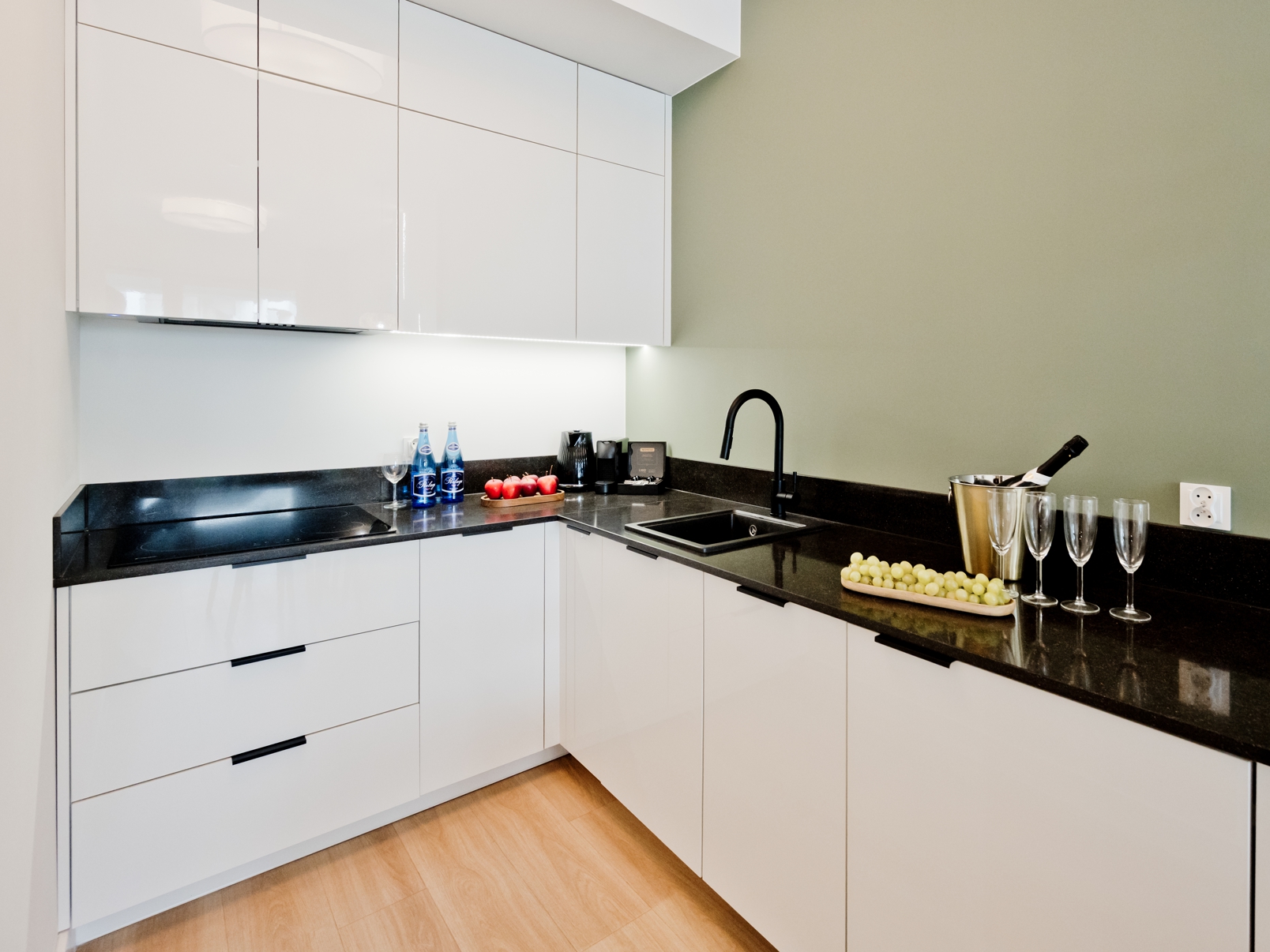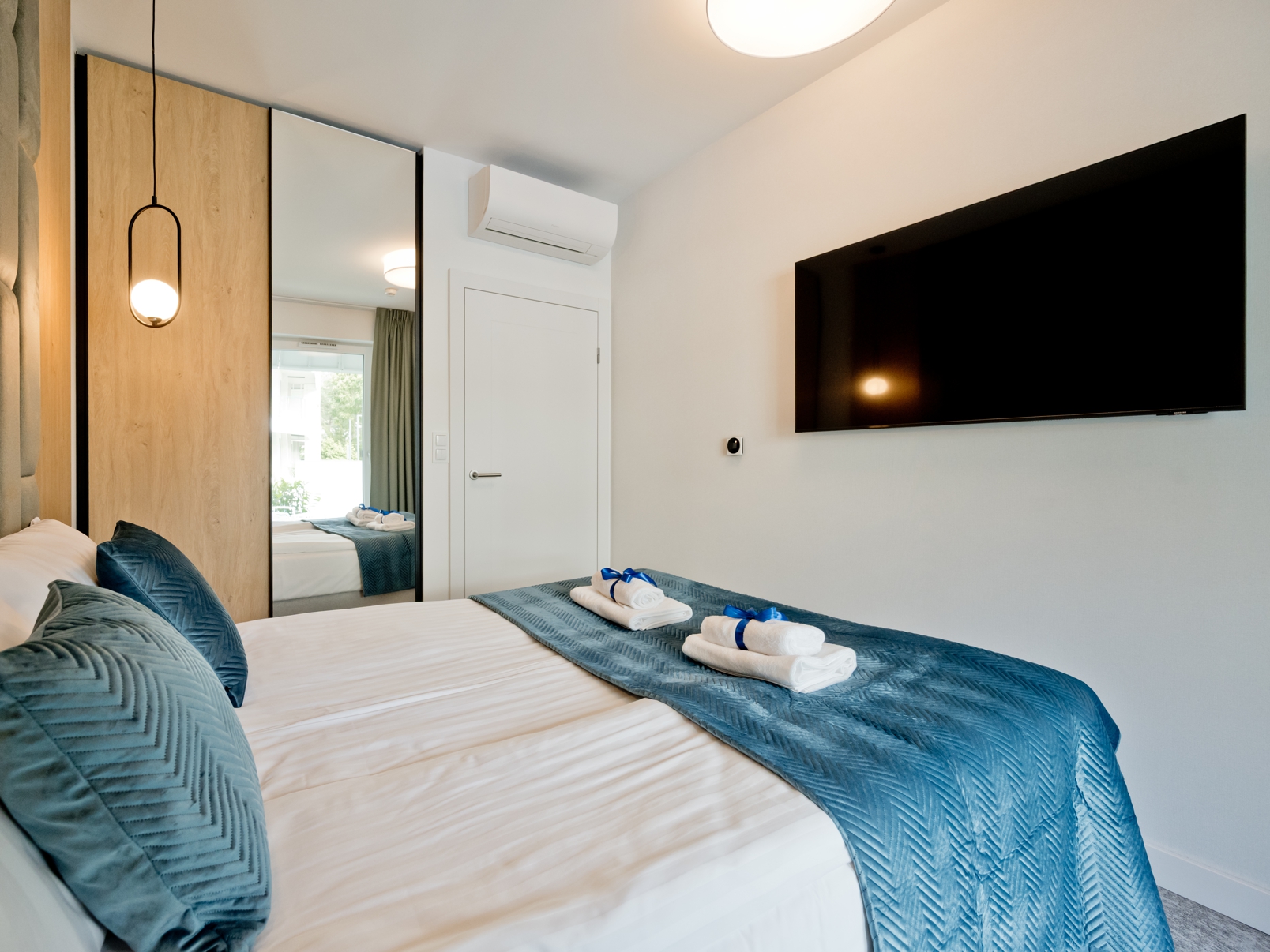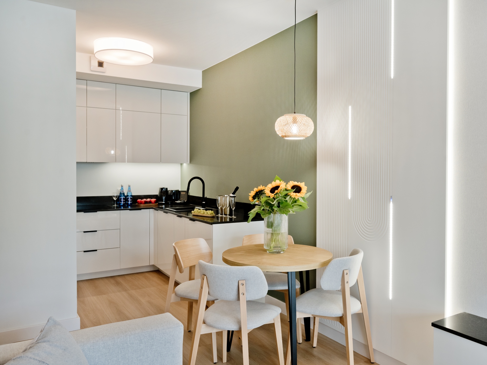 Goście apartamentu mają do dyspozycji szybkie Wi-Fi bez dodatkowych opłat, klimatyzację, w pełni wyposażony aneks kuchenny (płyta grzewcza, lodówka, ekspres do kawy, zmywarka), telewizor z płaskim ekranem oraz wygodną przestrzeń do wypoczynku i pracy. Apartament pomieści komfortowo do 4 osób – to doskonały wybór zarówno dla par, jak i rodzin z dziećmi. Do apartamentu przynależy miejsce postojowe na terenie hotelu.