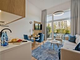 Luksusowy apartament dwupokojowy w kompleksie Anchoria Holiday z dostępem do strefy SPA, obejmujacej basen, saunę, siłownię oraz interaktywną salę zabaw.